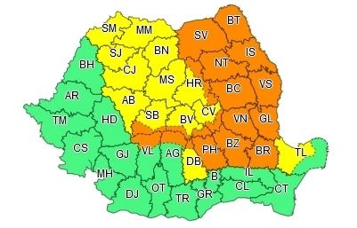 În județele Suceava, Botoșani, Neamț, Iași, Bacău, Vaslui, Vrancea, Galați, Buzău, Brăila, Prahova și zona de munte a județelor Vâlcea, Argeș, Dâmbovița, Sibiu, Brașov, Covasna și Harghita, vor fi perioade cu instabilitate atmosferică deosebit de accentuată. Vor fi vijelii puternice, intensificări ale vântului cu rafale de peste 70...80 km/h, frecvente descărcări electrice și grindină. Local vor fi averse torențiale, iar cantitățile de apă vor depăși 25...40 l/mp.
