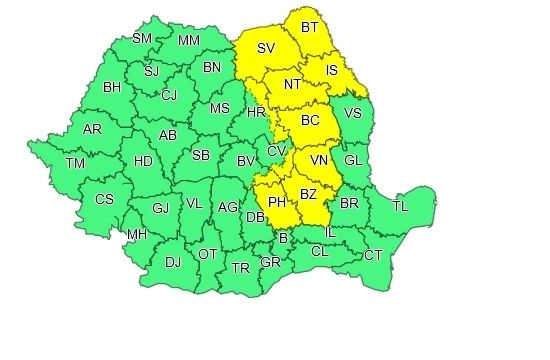 Administrația Națională de Meteorologie a emis o atenționare meteo cod galben de ploi violente și vânt puternic, valabilă pentru mai multe zone din țară. În paralel, a fost emis un cod galben de caniculă, valabil în partea de NV a țării.