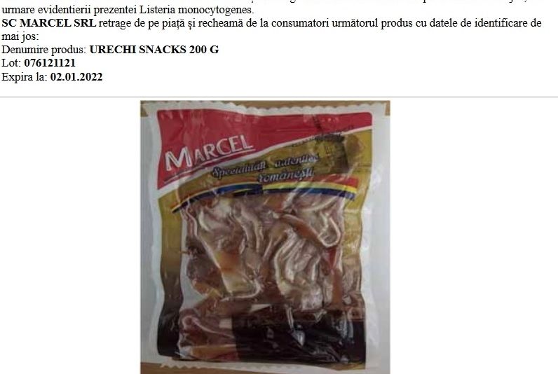 De asemenea, recheamă de la consumatori produsele cu datele de identificare Urechi Snacks 200 g, Lot: 076121121, care expiră pe 02.01.2022, respectiv Mușchi Țigănesc, Lot: 017121121, cu data de expirare 27.12.2021 / 06.01.2022.