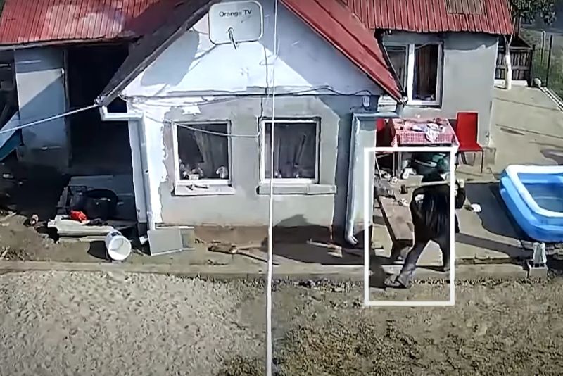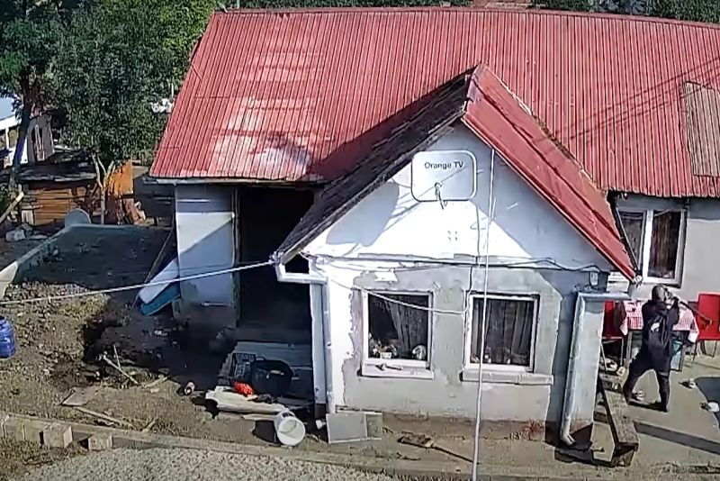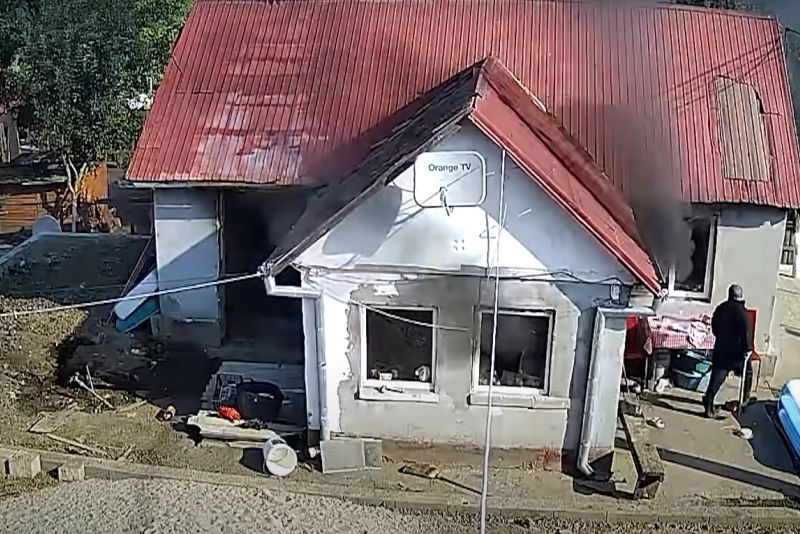 După ce îi sparge ușa și geamurile cu un topor, individul dă foc casei. Scenele șocante au fost surprinse de camera de supraveghere din curtea victimei.