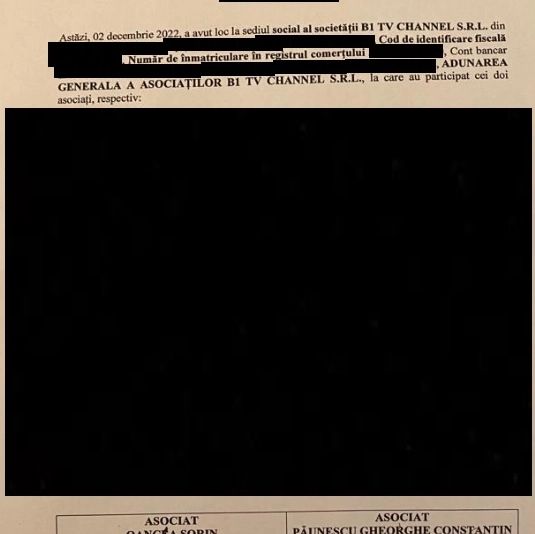 AGA din 2 decembrie a hotărât ca miercuri, 7 decembrie, administratorul societății B1 TV Channel S.R.L., Sorin Oancea, să prezinte rezolvarea contestației ANAF, unde se aduc acuzații grave societății B1 TV Channel S.R.L., și plata dividentelor la zi