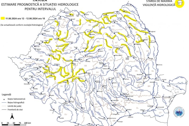Astfel, potrivit Institutului Naţional de Hidrologie şi Gospodărire a Apelor (INHGA), în intervalul 11 iunie, ora 12:00 - 12 iunie, ora 10:00, se vor produce viituri, creşteri de debite şi de niveluri, cu posibile depăşiri ale Cotelor de atenţie, pe râurile din bazinele hidrografice: