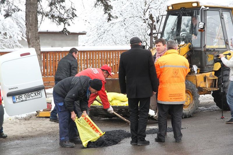 Gropile de pe Drumul Județean 132 de pe raza localității Vlăhița au fost plombate cu asfalt rece. Lucrările pentru soluționarea temporară a problemei au fost demarate în cursul zilei de joi, 14 februarie în prezenta președintelui Consiliului Județean Harghita, Borboly Csaba și a primarului localității Vlăhița, Molnár Tibor