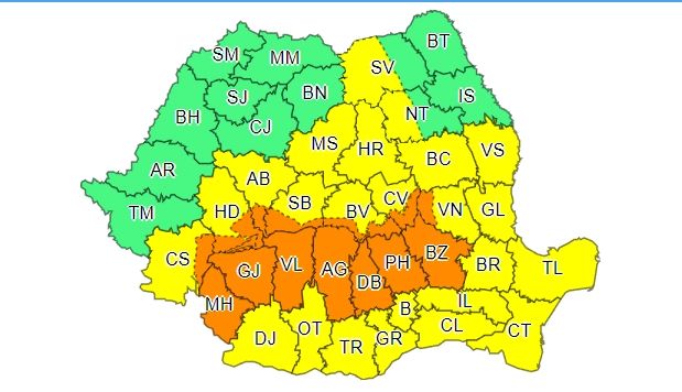 Local în nordul Olteniei și al Munteniei, precum și în Carpații Meridionali și de Curbură vor fi perioade cu averse torențiale, frecvente descărcări electrice, intensificări ale vântului și grindină. În intervale scurte de timp sau prin acumulare, cantitățile de apă vor depăși pe arii restrânse 40...60 l/mp.