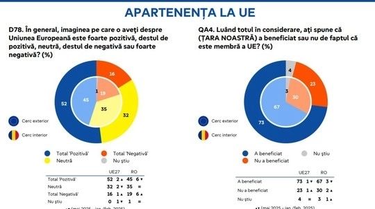 Doar 45% dintre români au o imagine pozitivă despre UE, cu 7 procente sub media la nivel european. 35% au o opinie neutră, puțin peste medie, în timp ce 19% au o imagine total negativă.