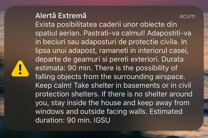 ”La ora 1:30, Inspectoratul General pentru Situaţii de Urgenţă a emis un mesaj RO-Alert pentru zona de nord a judeţului Tulcea prin care a informat populaţia despre posibilitatea căderii unor obiecte din spaţiul aerian şi măsuri de protecţie pe care trebuie să le ia în cazul în care situaţia o impune. Mesajul a fost transmis în urma informării şi colaborării strânse avute cu Ministerul Apărării Naţionale şi cu structurile ce monitorizează spaţiul aerian românesc”, a anunţat, vineri dimineaţă, ISU Tulcea.