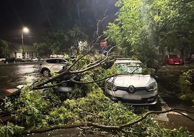 Rafalele violente de vânt au făcut prăpăd în București. Zeci de copaci au fost doborâți, iar 70 de mașini au fost distruse. Un copac uriaș a căzut peste două mașini parcate în curtea unui bloc din Sectorul 1 al Capitalei.